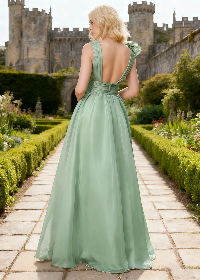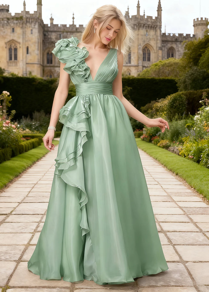 This gorgeous sage green chiffon prom dress ruffles is perfect for your special night! It has a deep V-neck and is long enough to touch the floor. Made from soft satin-faced chiffon, it feels smooth and light. You'll love the pretty handkerchief ruffles on one shoulder and down the skirt. The dress is fully lined with built-in cups and boning for extra comfort and support. A hidden back zipper makes it easy to put on. Wear this stunning gown to your prom, black-tie wedding or any fancy party and feel like a star!