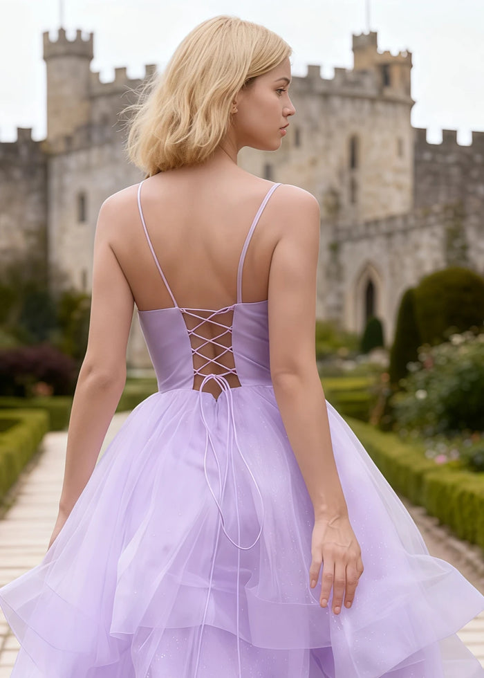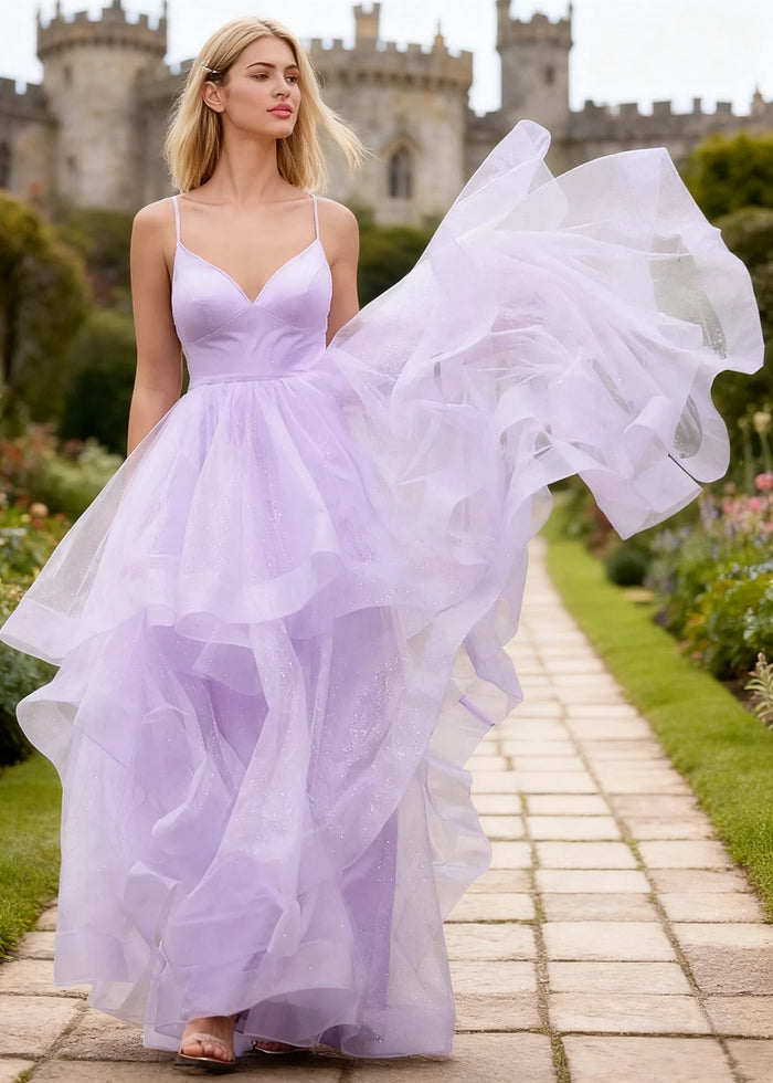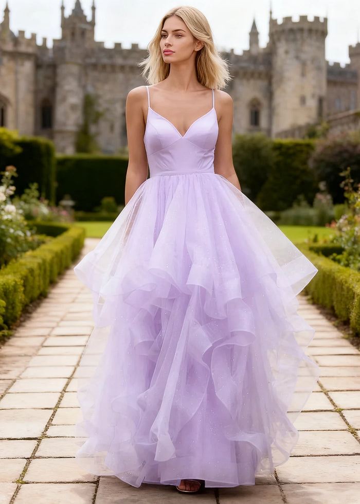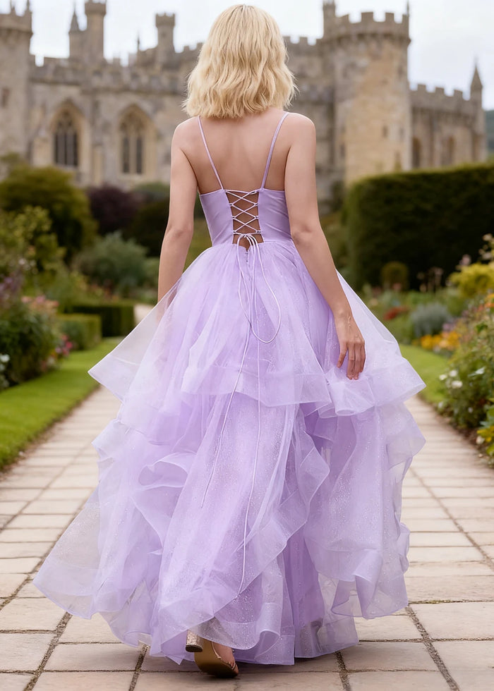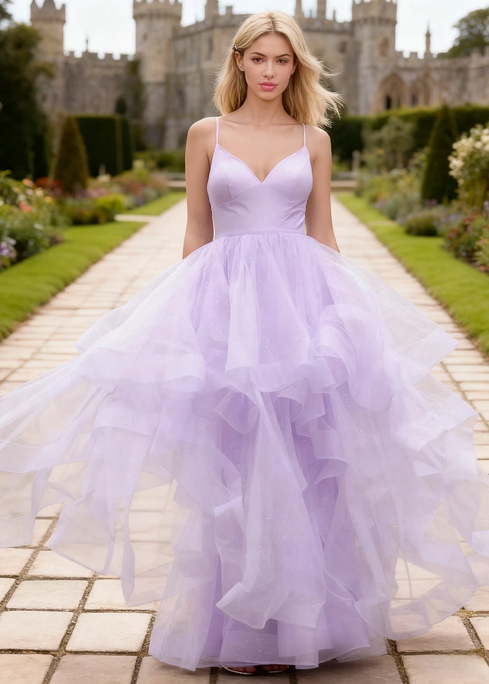 Check out this amazing lilac glitter tulle ruffled prom dress. It's perfect for your special night.