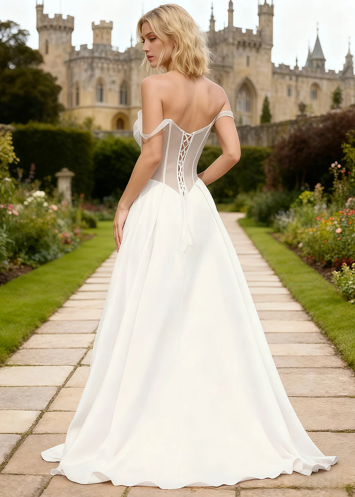 Meet your dream white satin prom dress corset! This beautiful black gown is both elegant and comfortable. The off-the-shoulder top has a corset style that fits you nicely. At the back, a lace-up design lets you adjust the dress for a perfect fit. The long skirt is made of shiny satin and light tulle, so it flows gracefully when you move. It also has a high slit to add a touch of charm. Plus, the dress is fully lined inside, making it soft against your skin. Ideal for proms, parties, or weddings, this dress will help you shine on your special night!