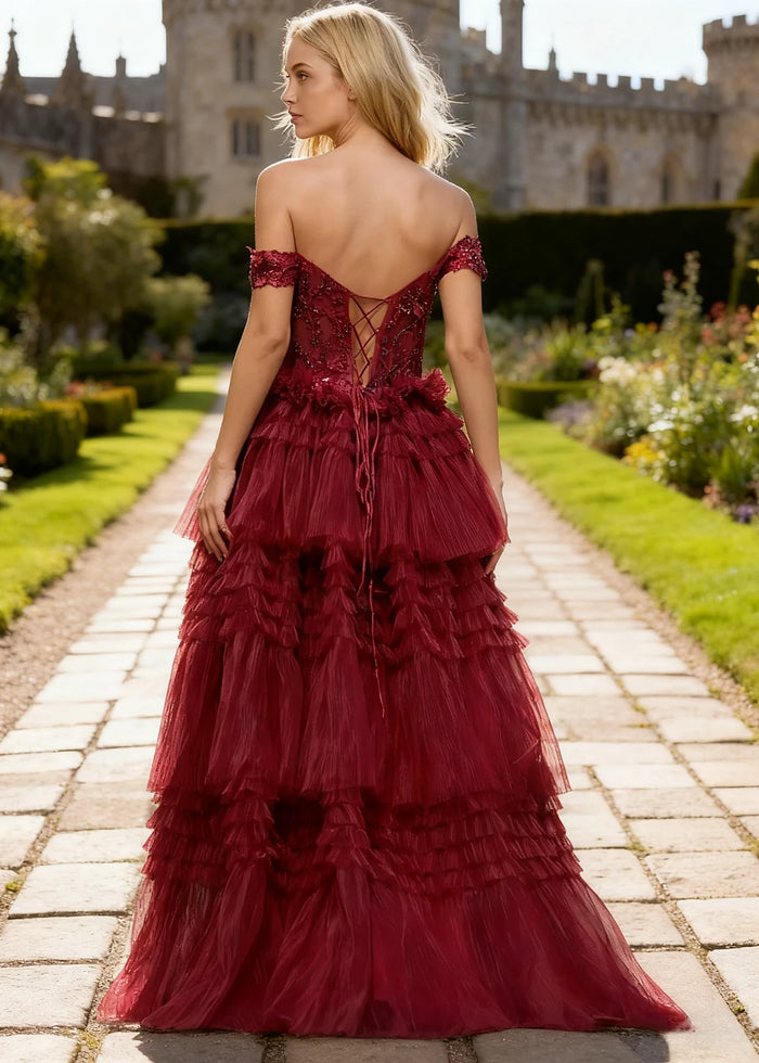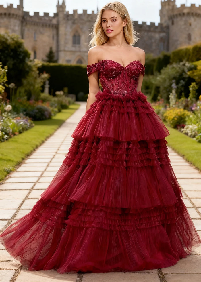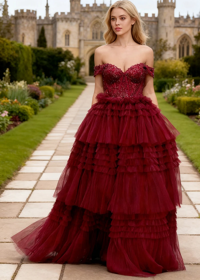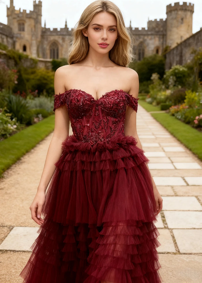 Look stunning in our beautiful sparkly burgundy tiered tulle prom dress! It's perfect for your special night. This dress has sparkly sequins and pretty lace all over. The top is off-the-shoulder with a sweetheart neckline. The skirt is made of soft tulle layers, so it's full and fluffy. The back ties up with a cute lace-up design. Inside, it's fully lined for comfort. You'll feel like a princess at prom, weddings, or any fancy party. Get ready to turn heads and have fun!