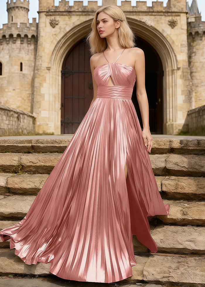 Look stunning in this beautiful metallic pink prom dress! The dress has a thin strap design that is adjustable for comfort. The skirt is long and flowy with soft pleats that catch the light. A high slit adds a touch of boldness, showing off your leg when you move. The bodice features a modern cutout detail for a chic look. Inside, the dress is fully lined, so it feels smooth against your skin. A back zipper makes it easy to wear. This gown is perfect for proms, parties, or any special event. You will stand out and feel confident!