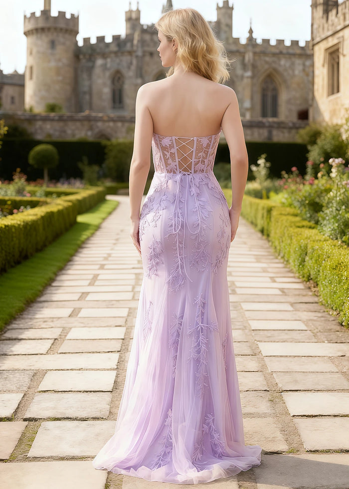 This dress is so pretty! It's a lavender lace beaded dress that is perfect for prom. The top is strapless with a sweetheart neckline. It has a lace-up back so you can adjust the fit. The whole dress is covered with beautiful floral lace embroidered. The skirt is long and flowy, made of soft tulle. There is a high slit on the side to show your leg. It is fully lined inside, making it comfortable to wear. This style is perfect for any occasion, especially prom or pageants!